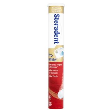 For optimum cleaning results we recommend using Steradent Pro White twice a day. • Rinse denture. Place one Steradent Pro White tablet together with your denture in a glass. Replace cap firmly after use. -